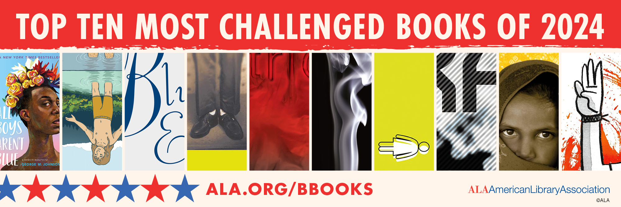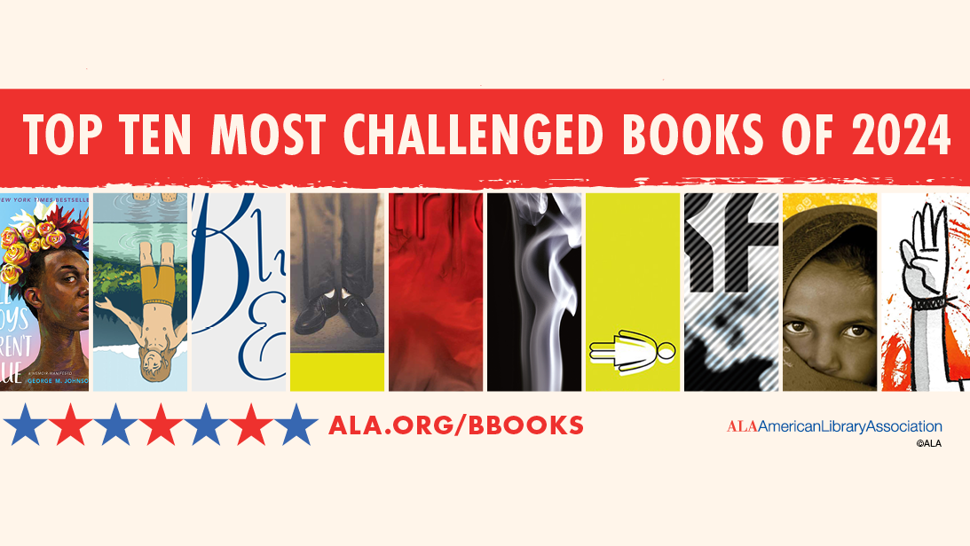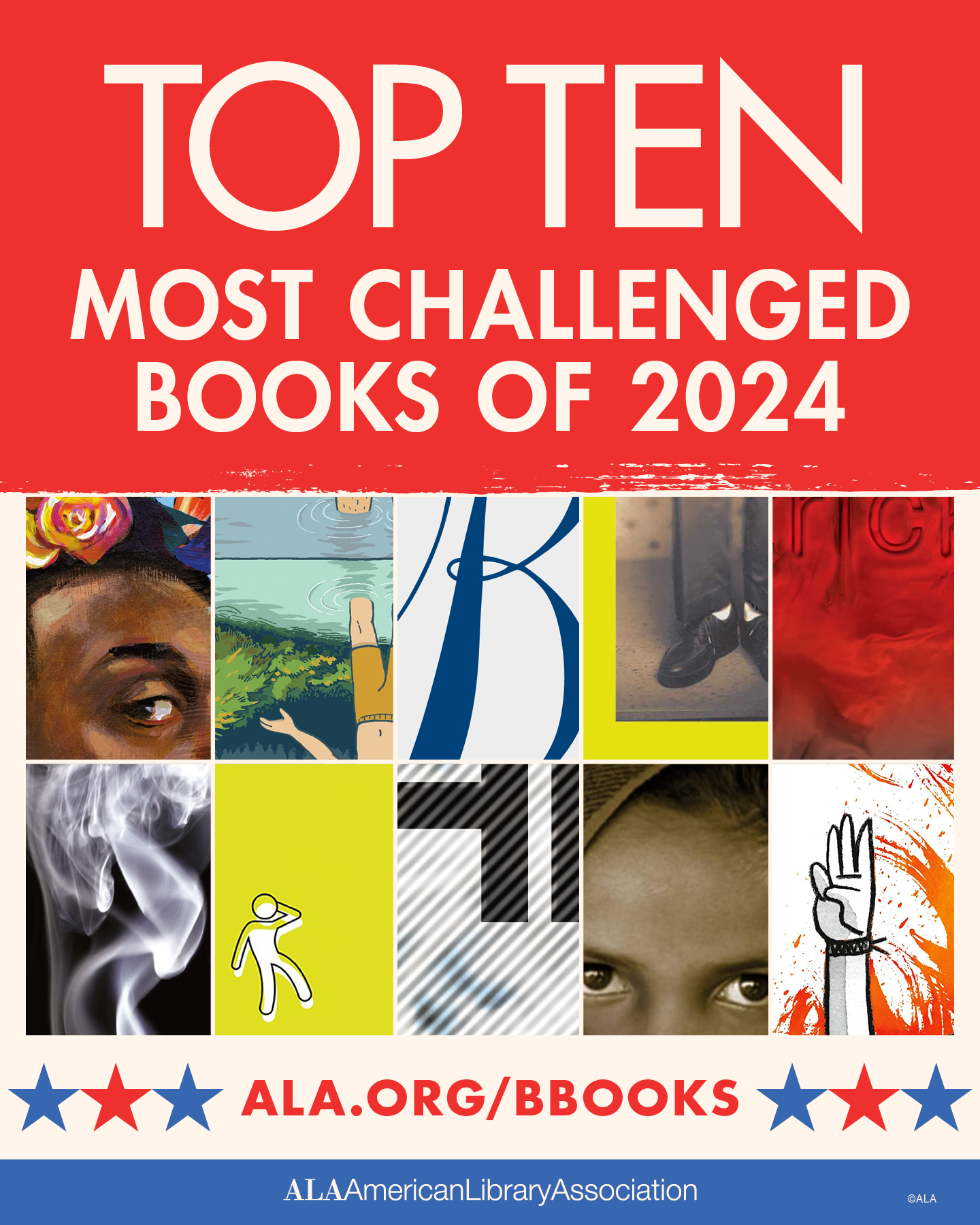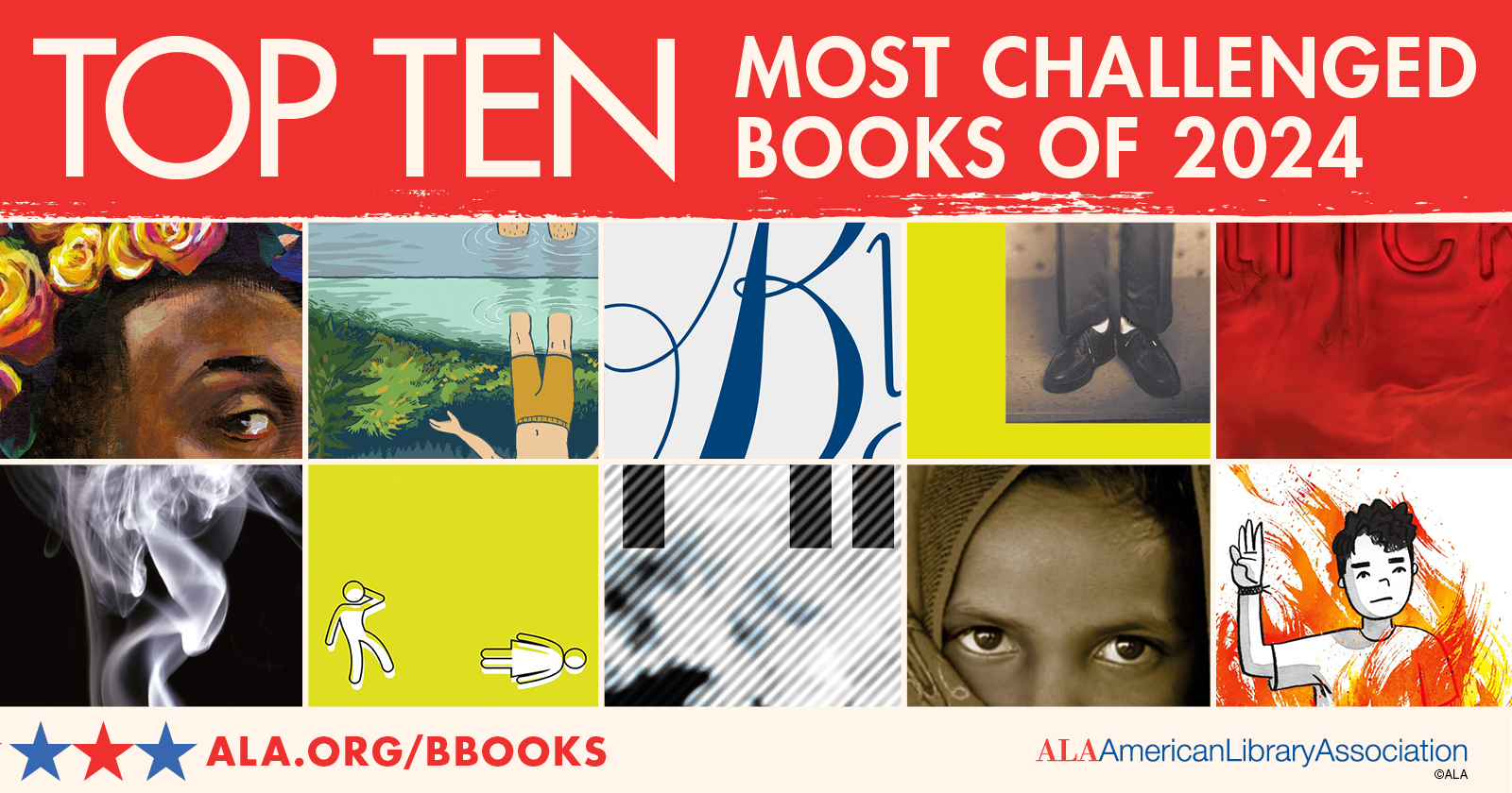 Infographic depicting the Top 10 Most Challenged Books of 2024. Collage of book covers, authors, and titles. The American Library Association documented 821 attempts to censor materials and services at libraries, schools, and universities in 2024. The most common reasons for challenges were false claims of illegal obscenity for minors; inclusion of LGBTQIA+ characters or themes; and dealing with topics of race, racism, inclusivity, equity, and social justice.